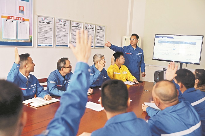 中國(guó)能建易普力公司定期組織班組討論會(huì),讓一線職工在進(jìn)行各類技能培訓(xùn)和業(yè)務(wù)學(xué)習(xí)的同時(shí),也積極提出合理化建議,共同解決生產(chǎn)過(guò)程中的問題。圖為10月22日,該公司的一家工廠內(nèi),職工正在召開班組討論會(huì)。本報(bào)記者 王偉偉 攝