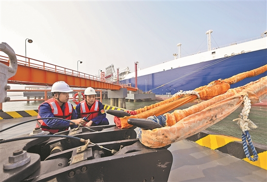 10月29日,工作人員在中國(guó)石化天津LNG接收站2號(hào)泊位巡檢。