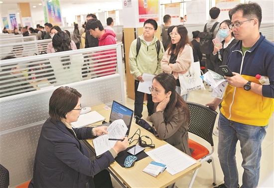 10月30日,求職者和用人單位代表在招聘會現(xiàn)場洽談。
