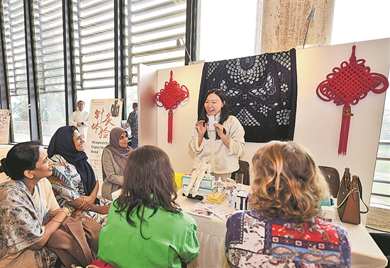 國(guó)際人士在瑞士日內(nèi)瓦萬國(guó)宮體驗(yàn)中醫(yī)診療