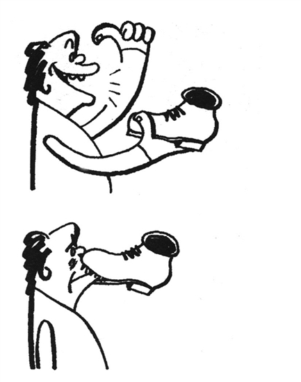 “名鞋”剛剛與名腳“牽手成功”,便得意忘形、肆無忌憚,以至開口大笑、皮開肉綻。名腳畢竟不是普普通通的“角兒”,何以咽得下這口悶氣,二話不說便以最快的速度把鞋子甩向名嘴。名嘴還想施展口才,怎奈被那只破口(說不定還想大罵)的鞋子緊緊“咬”住嘴。名嘴推銷劣質(zhì)產(chǎn)品,被投訴,被處理,因而信譽(yù)掃地、進(jìn)而失去施展口才的機(jī)會,當(dāng)下人們對這情境有種形象的描述,叫作“翻車”,也有人稱之為“打臉”,可見,“夾嘴”是“打臉”的升級版本。