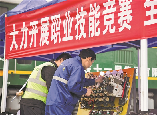11月2日,中鐵十一局工人(右)在位于西安市的西延高鐵閻良鋪軌基地參加鐵路機(jī)車制修項(xiàng)目競(jìng)賽。當(dāng)日,一場(chǎng)職業(yè)技能競(jìng)賽在中鐵十一局西(安)延(安)高鐵閻良鋪軌基地舉行。100余名高鐵建設(shè)者在工程測(cè)量、鐵路機(jī)車制修、維修電工等十余個(gè)競(jìng)賽項(xiàng)目中切磋技藝,弘揚(yáng)工匠精神。
