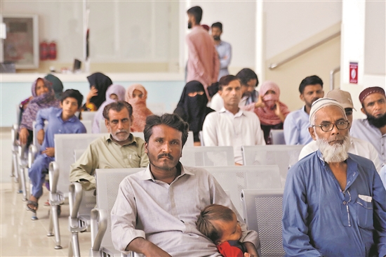 圖為近日在巴基斯坦西南部俾路支省瓜達爾,當?shù)孛癖娫谥邪陀颜x醫(yī)院的門診大廳候診。新華社發(fā)(艾哈邁德·卡邁勒 攝)