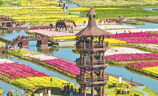 10月29日,游客在江蘇省興化市千垛景區(qū)賞菊游玩(無人機(jī)照片)。金秋時節(jié),神州大地層林盡染,色彩斑斕,秋色宜人。 新華社發(fā) (周社根 攝)