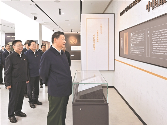 11月4日至6日,中共中央總書記、國家主席、中央軍委主席習(xí)近平在湖北考察。這是4日下午,習(xí)近平在孝感市云夢縣博物館參觀出土秦漢簡牘展。 新華社記者 謝環(huán)馳 攝