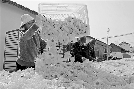 11月6日,河南省許昌市鄢陵縣張橋鎮(zhèn)裴莊村村民在采收金絲皇菊。