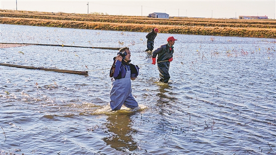 10月12日,在黑龍江撫遠蔓越莓基地,科普時報記者季春紅采訪工人們利用拉網(wǎng)的方式收集蔓越莓。畢玉才 攝