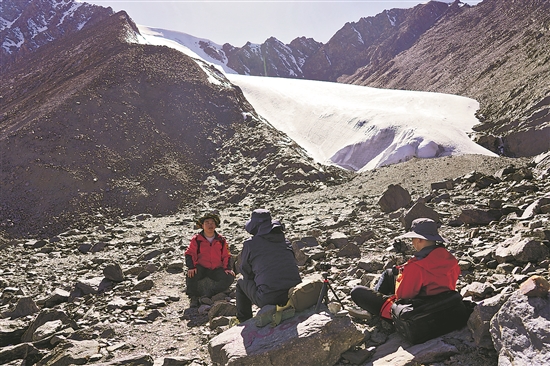 5月11日,新疆昌吉市,最高檢影視中心攝制組在天山“一號冰川”保護區(qū)采訪拍攝。何煦 攝