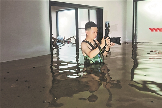 6月30日,浙江省湖州市長興縣煤山鎮(zhèn)新民村,長興縣融媒體中心首席記者譚云俸在地下室1米多深的水中拍攝。受訪者供圖