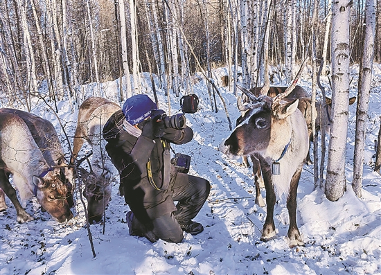 2023年12月18日,在內(nèi)蒙古敖魯古雅鄂溫克民族鄉(xiāng)馴鹿部落,人民政協(xié)報記者齊波冒著零下43攝氏度嚴寒拍攝馴鹿。受訪者供圖