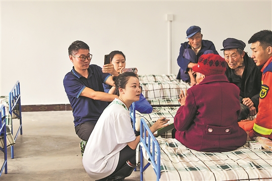 7月20日,四川省雅安市漢源縣馬烈鄉(xiāng)新華村突發(fā)山洪災害,雅安市融媒體中心記者張雨蝶(前排左一)和同行在安置點采訪受災群眾。郝立藝 攝