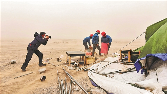 5月14日,在新疆若羌縣750千伏且末—若羌輸電線路施工現(xiàn)場,國網(wǎng)山東電力融媒體中心記者徐可在沙漠中采訪拍攝電網(wǎng)員工。 受訪者供圖