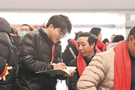1月26日,春運首日,在西安北客站,工人日報社陜西記者站記者祝盼采訪愛心專列免費送務工人員平安返鄉(xiāng)活動。李一博 攝