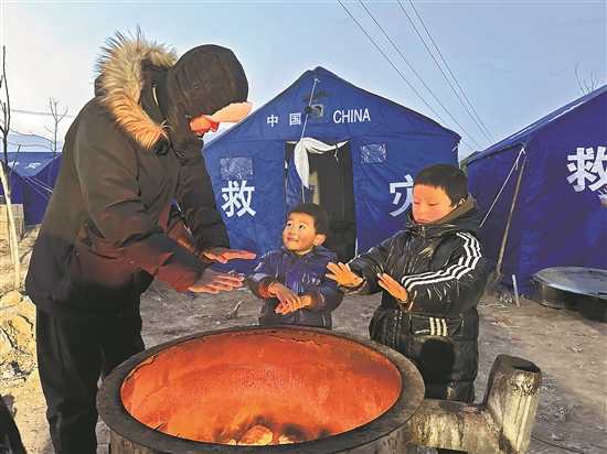 2023年12月21日,大皖新聞記者余康生在甘肅積石山地震震區(qū)現(xiàn)場采訪。傍晚天氣寒冷,記者和兩名災區(qū)的小朋友一邊烤火一邊交談。 孫召軍 攝