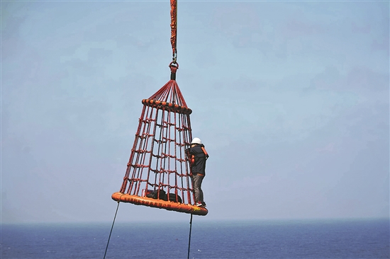 2月20日,在距離海南三亞市90公里的崖城13-1氣田所在海域,海南日報新媒體視覺中心記者袁琛在深海一號二期工程采訪中搭乘吊籃出行。 周宇 攝