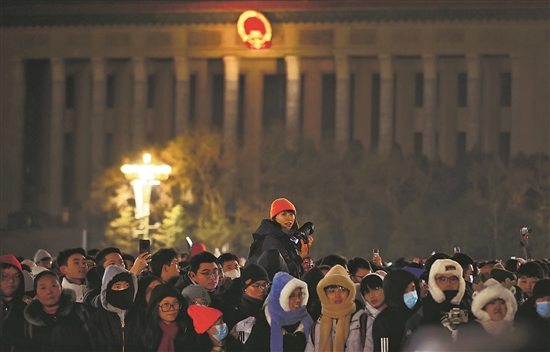 1月1日,北京天安門廣場,新京報記者薛珺等待拍攝新年升國旗儀式。郭謙 攝