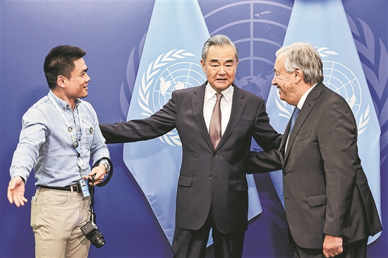 9月27日,中共中央政治局委員、外交部長王毅(圖中)在紐約聯(lián)大期間會見聯(lián)合國秘書長古特雷斯(右一)。與媒體見面期間,古特雷斯特意點名總臺記者徐德智,向王毅介紹他是在聯(lián)合國“非常努力的記者”。受訪者供圖