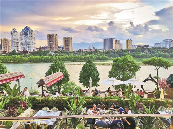 日落時(shí)分,在云南省西雙版納州景洪市瀾滄江邊,游客們邊欣賞江景邊享受美食。