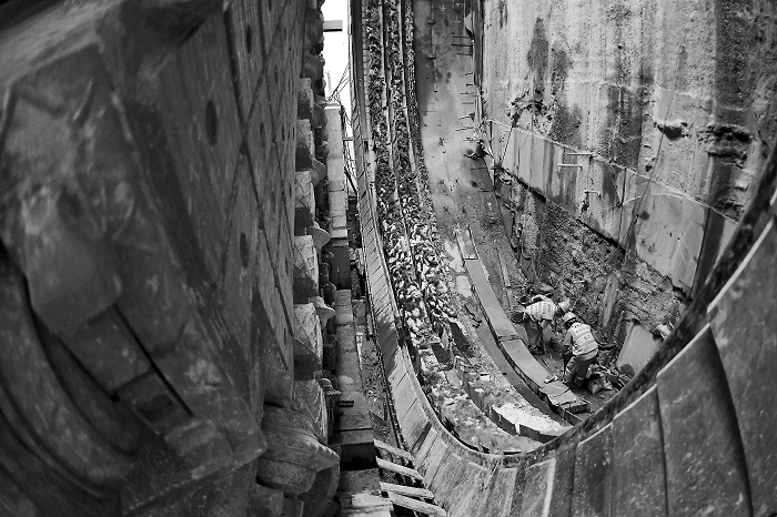 圖為作業(yè)人員在盾構(gòu)機刀盤前填裝密封油脂。張璽 攝
