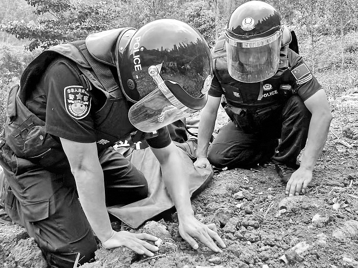 八里河?xùn)|山村,民警張森、白志強(qiáng)正在排雷。