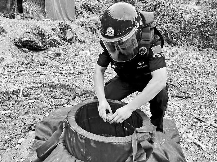 民警小心翼翼地將地雷放入排爆毯內(nèi)。