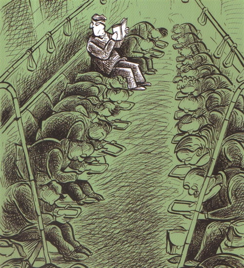 “低頭族”處處可見,地鐵上的他們眼睛直視手機(jī)屏幕,忘我地融入虛擬世界。瞧,閱讀者“扎眼”地坐著讀書,真是少見多怪啦!