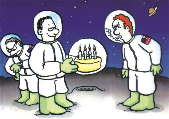 飛船抵達(dá)外星球,恰巧宇航員過生日,朋友們手捧蛋糕邀請“壽星”吹蠟燭,豈料這里沒有氧氣和水……這個生日如何出彩?
