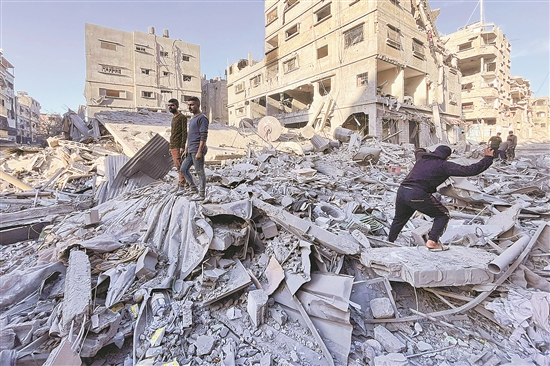當(dāng)?shù)貢r(shí)間11月17日,在加沙地帶北部城鎮(zhèn)拜特拉希亞,人們聚集在一幢遭襲房屋的廢墟附近。