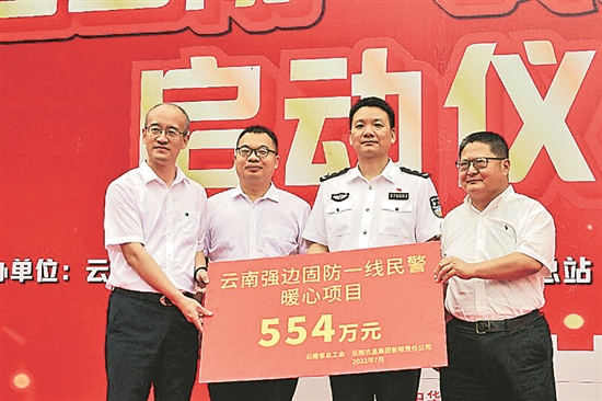 云南工會(huì)“暖邊固防”行動(dòng)始終重視各單位、各部門的協(xié)同,形成關(guān)愛合力。圖為省總工會(huì)黨組書記、常務(wù)副主席王宏(右一)和云南農(nóng)墾集團(tuán)一起為一線民警暖心項(xiàng)目“添柴”。
