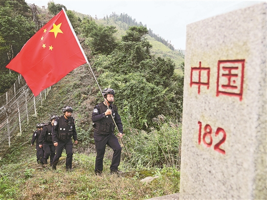 云南文山邊境管理支隊(duì)的民警在界碑旁巡邏。云南省總工會(huì)以及涉邊的8個(gè)州市工會(huì)開展“暖邊固防”行動(dòng),為他們送去關(guān)愛。