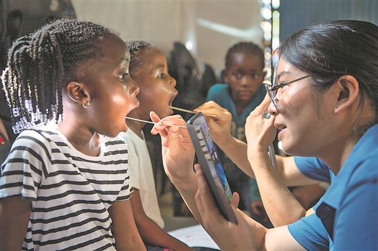 當(dāng)?shù)貢r(shí)間11月20日,在納米比亞首都溫得和克附近的弗蘭斯藝術(shù)培訓(xùn)中心,中國(guó)醫(yī)生給孩子們進(jìn)行口腔健康檢查。