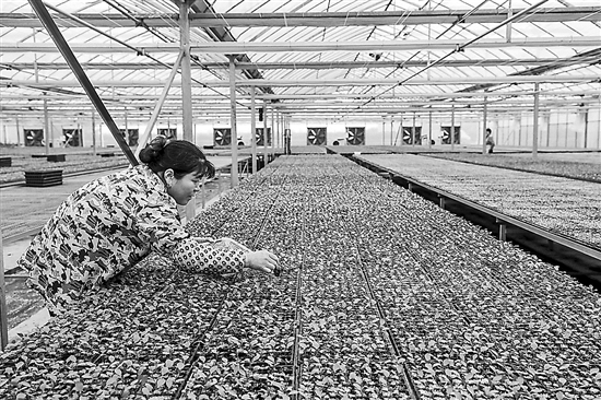 11月18日,在浙江省杭州市錢(qián)塘區(qū)的“勿忘農(nóng)集團(tuán)科研中心”蔬菜大棚內(nèi),工人在養(yǎng)護(hù)適合“陽(yáng)臺(tái)菜園”種植的蔬菜種苗。
