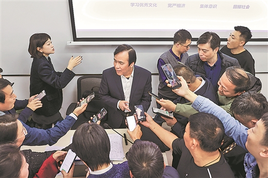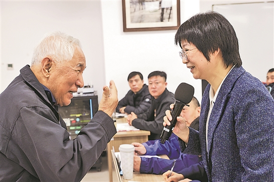 11月11日,中國工程院院士、清華大學(xué)化工科學(xué)與技術(shù)研究院院長金涌(左一)在課程結(jié)束后,回答全國勞動模范何光華的問題。