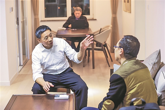 11月14日22時許,清華大學(xué)雙清公寓,培訓(xùn)營學(xué)員謝大春(左一)和郭春光就“如何留住高技能人才”的問題展開討論。