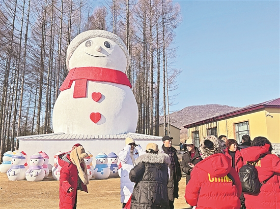 游客在哈雪谷旅游度假村的雪人造型前拍照(11月20日攝)。