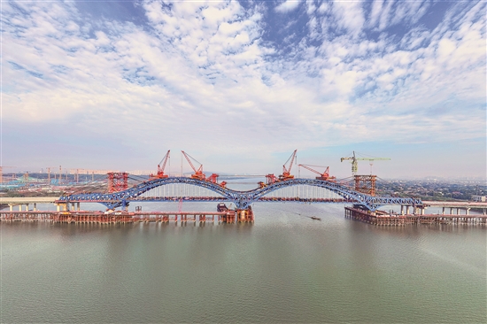 當日,隨著主跨合龍段最后一段橫梁安裝完成,長沙暮坪湘江特大橋順利合龍。