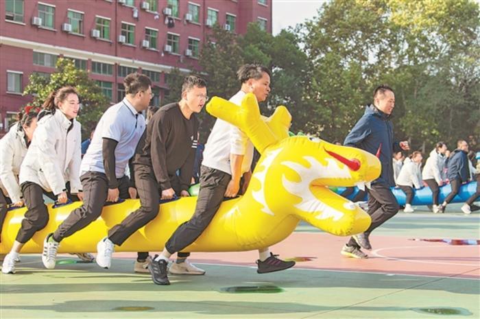 11月24日,浙江省金華市第一中等職業(yè)學(xué)校運(yùn)動(dòng)場上,當(dāng)?shù)仄髽I(yè)職工在進(jìn)行“齊心協(xié)力向前沖”運(yùn)動(dòng)比賽。