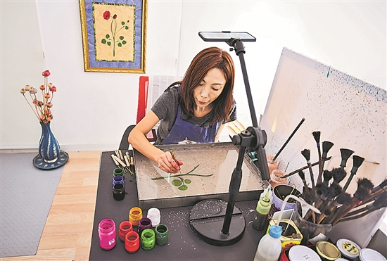 土耳其水拓畫是一種“水上作花、紙拓成畫”的古老繪畫技藝,2014年被聯(lián)合國教科文組織列入世界非物質(zhì)文化遺產(chǎn)名錄。2007年,在西安長大的李昕桐定居土耳其伊斯坦布爾,并開始學(xué)習(xí)水拓畫。她不斷嘗試將水拓畫與中國元素相結(jié)合,將水拓畫拓在中式服飾、絲扇、絲巾上,將絲路駝鈴、粽子、龍、福字等圖案做成水拓畫,并將作品展現(xiàn)給土耳其民眾。近年來,她時(shí)常往返中國和土耳其,開展講座和培訓(xùn),在中國傳授水拓畫技藝,為增進(jìn)中土兩國文化交流而努力。圖為近日,李昕桐在土耳其伊斯坦布爾的家中繪制水拓畫。