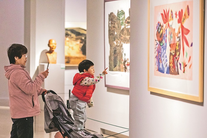 圖為11月27日,一名家長(zhǎng)帶著孩子在欣賞美術(shù)作品。本報(bào)記者 王偉偉 攝