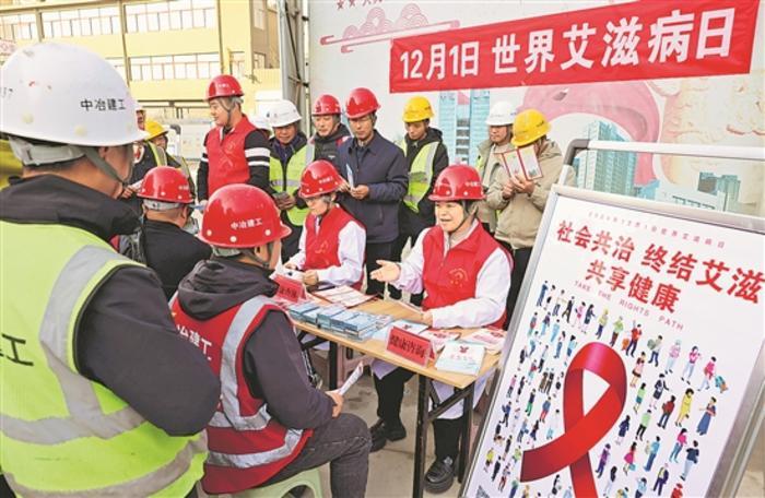 12月1日是第37個世界艾滋病日,在山東省棗莊市光明路街道一處建筑工地,醫(yī)務志愿者向建筑工人宣講艾滋病防治知識。各地開展主題宣傳活動,增強人們對艾滋病防治知識的了解。 新華社發(fā) (孫中喆 攝)