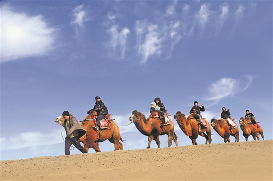12月1日,游客在甘肅省敦煌市鳴沙山月牙泉景區(qū)騎駱駝?dòng)斡[。