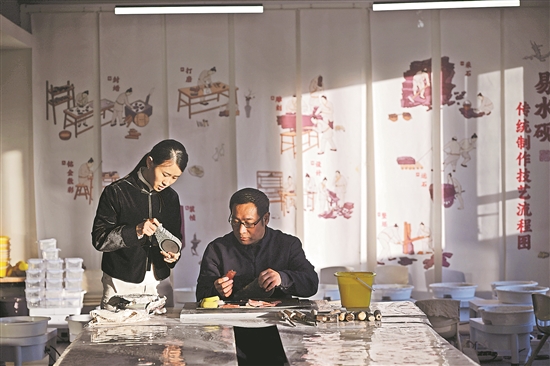 鄒天然一直在參與易水硯的創(chuàng)作和推廣,大學時就曾組織同學們來家鄉(xiāng)參觀、了解硯文化。2012年,她大學畢業(yè)后回到家鄉(xiāng),為易水硯文化的傳承與發(fā)展注入了新活力。她創(chuàng)新設計的手把硯、文博文創(chuàng)硯等系列硯,在全國文房四寶藝術博覽會上獲得多枚金獎。新華社記者 金良快 攝