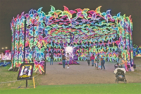 近日,來自中國四川自貢的彩燈展亮相美國得克薩斯州達拉斯市南郊,吸引了大批當?shù)鼐用袂皝碛^看。圖為近日,在美國得克薩斯州達拉斯市南郊的彩燈展上,人們觀賞彩燈。新華社發(fā) (田丹 攝)