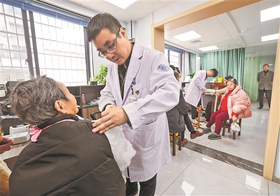 12月3日,在安華鎮(zhèn)中心衛(wèi)生院的中醫(yī)骨傷科,醫(yī)生給患者進行康復治療。