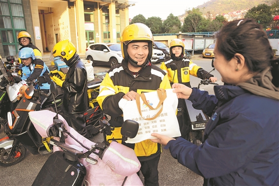 當(dāng)日,連云區(qū)墟溝街道南巷社區(qū)為新就業(yè)形態(tài)勞動(dòng)者開展“冬日送溫暖 情暖新業(yè)態(tài)”活動(dòng),向外賣騎手、快遞小哥進(jìn)行“連新碼”服務(wù)小程序使用和消防安全知識(shí)培訓(xùn),贈(zèng)送抱枕、防寒手套、暖手寶等保暖用品,送上冬日里的愛心關(guān)懷。