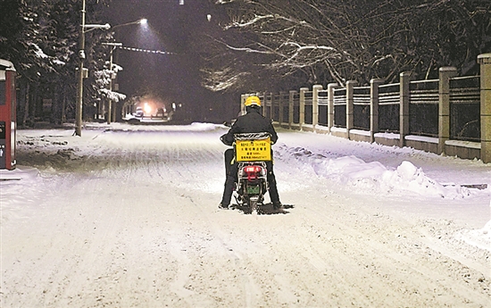 近日,黑龍江多地迎來暴雪天氣,氣溫大幅降低。11月27日晚,記者在齊齊哈爾街頭看到,一位正在送餐的外賣小哥因地面積雪,車轱轆不時打滑。雪天道路濕滑,請外賣小哥小心慢行,注意安全,也請顧客給他們多一些時間。(本報記者 曹玥 史宏宇)