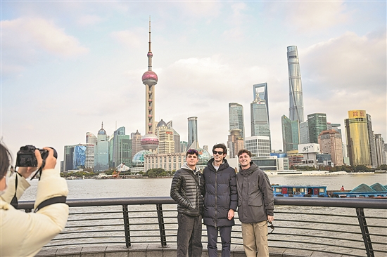 12月4日,來自西班牙的游客在上海外灘拍照留影。