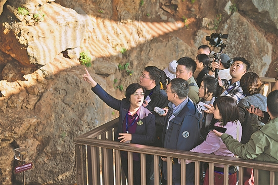12月6日,在安徽省池州市東至縣,中國科學(xué)院古脊椎動(dòng)物與古人類研究所研究員吳秀杰(前左一)在介紹華龍洞遺址。