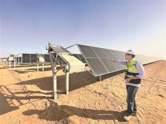 圖為近日,在埃及南部阿斯旺省沙漠中的康翁波光伏電站,工作人員介紹光伏發(fā)電情況。