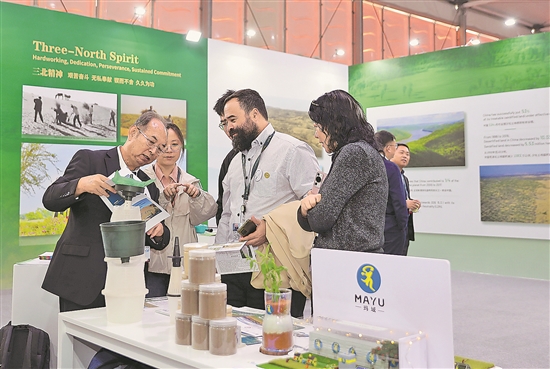 近日,參會者在沙特阿拉伯利雅得的《聯(lián)合國防治荒漠化公約》大會中國館參觀。新華社記者 王東震 攝
